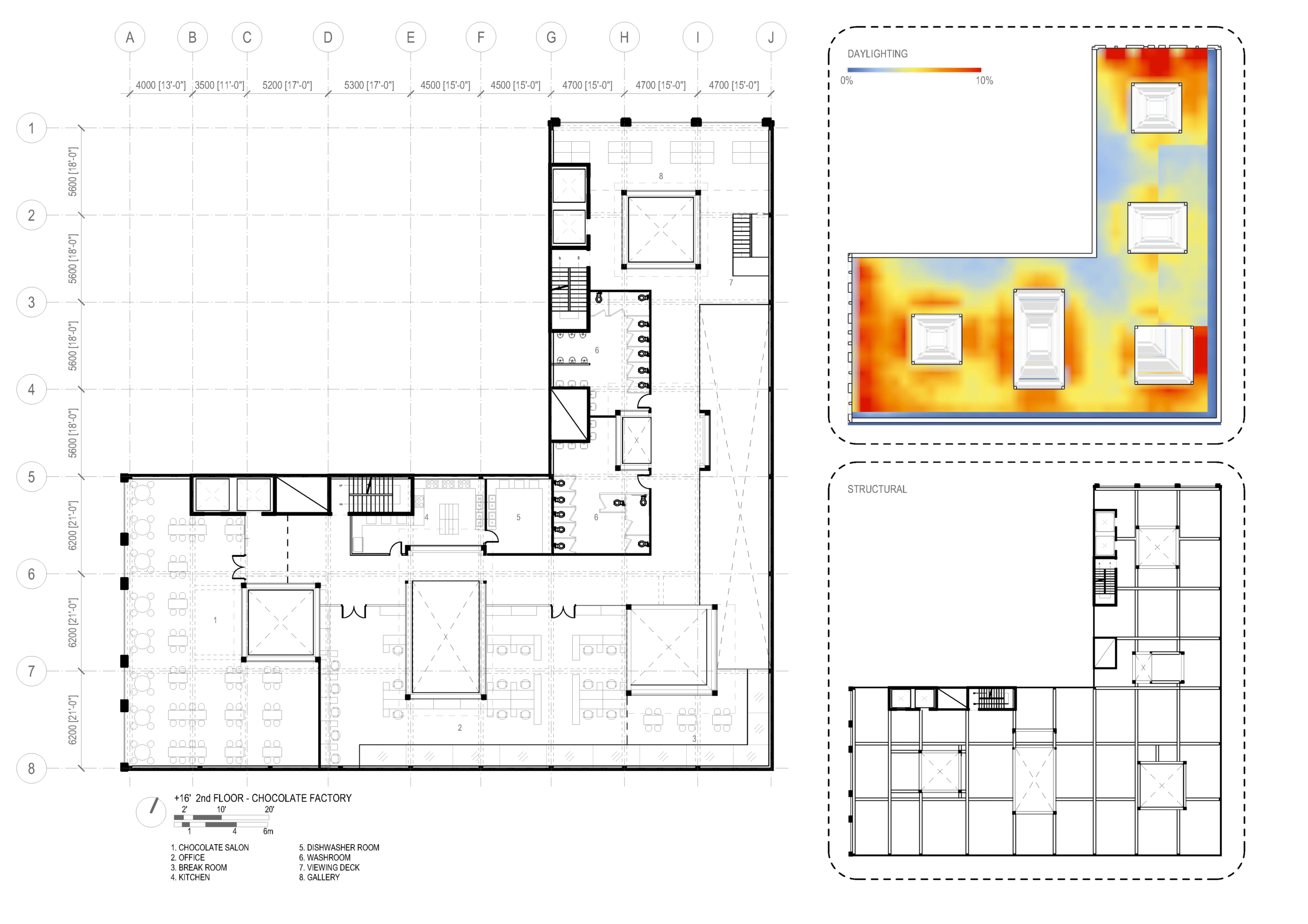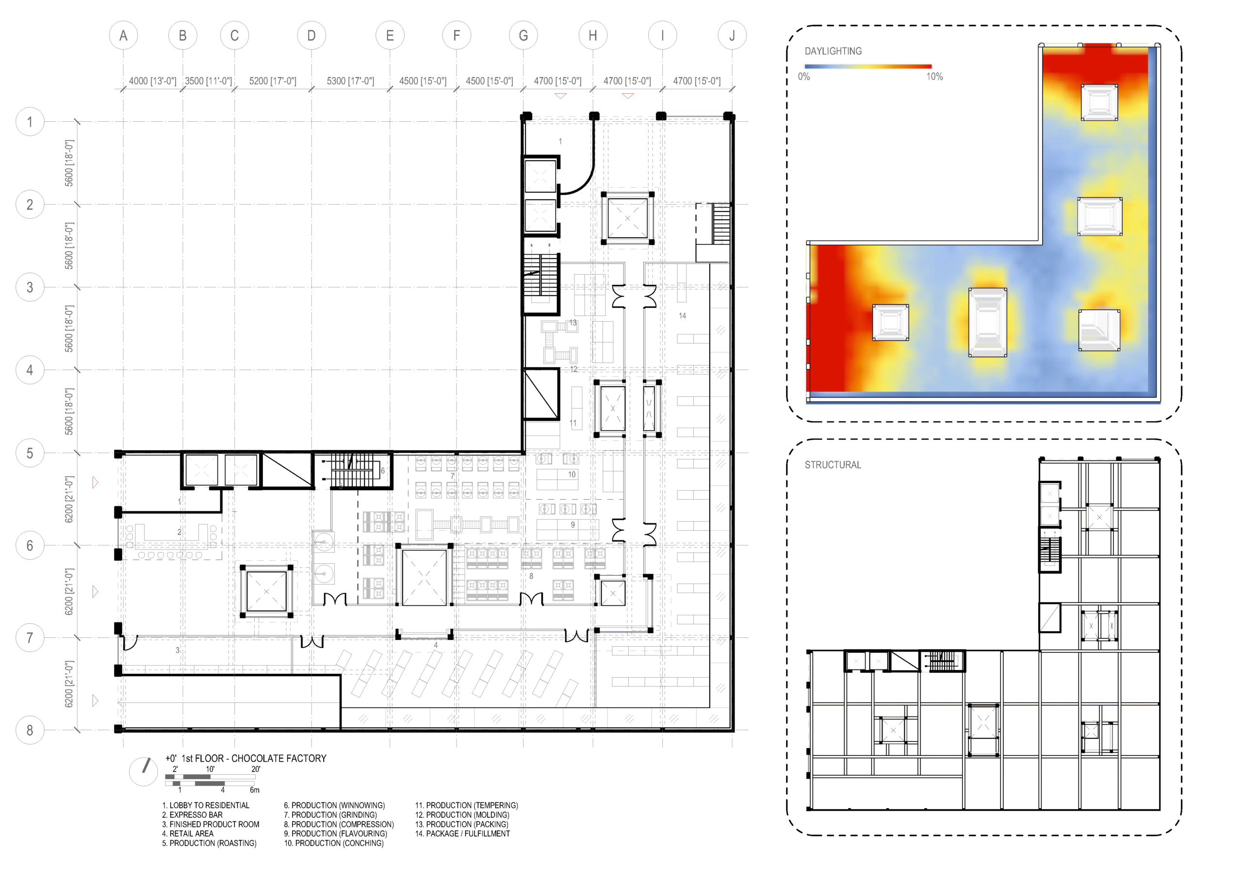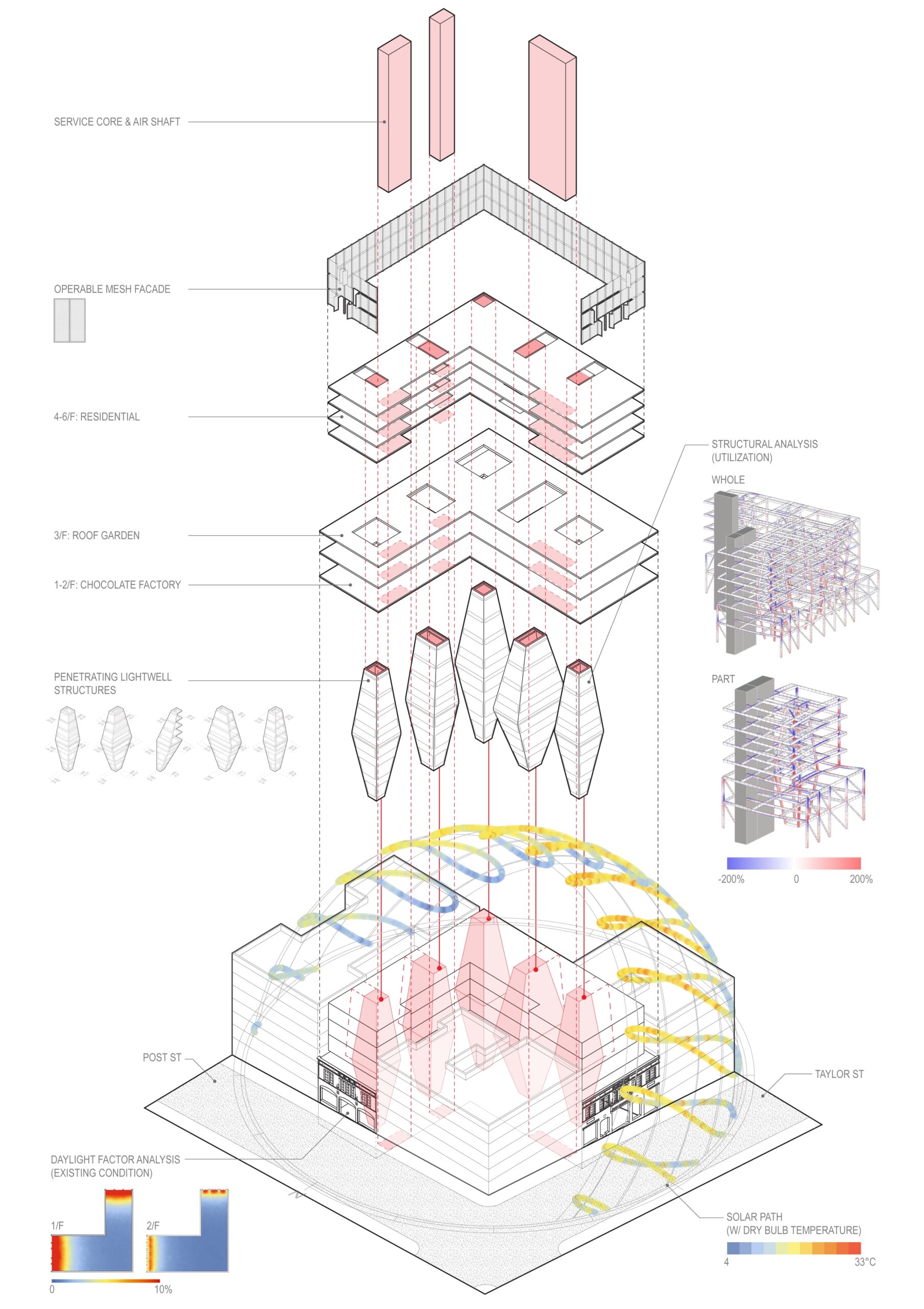 This project revitalizes one of San Francisco’s historic 1920s garages, reimagining it as a modern mixed-use development that seamlessly combines heritage preservation, artisan industry, and much-needed housing. While the elegant, ornamented façade of the existing building is carefully preserved as a cultural marker of the city’s past, the interior is transformed into a light-filled and contemporary chocolate factory for a small artisan chocolatier. More than a production space, the factory is conceived as an experiential destination, offering chocolate-making courses, guided factory tours, and a curated retail experience. Supporting functions include an espresso bar, café, and chocolate salon, alongside production, office, and storage spaces that demand large, open spans for flexibility and efficiency.