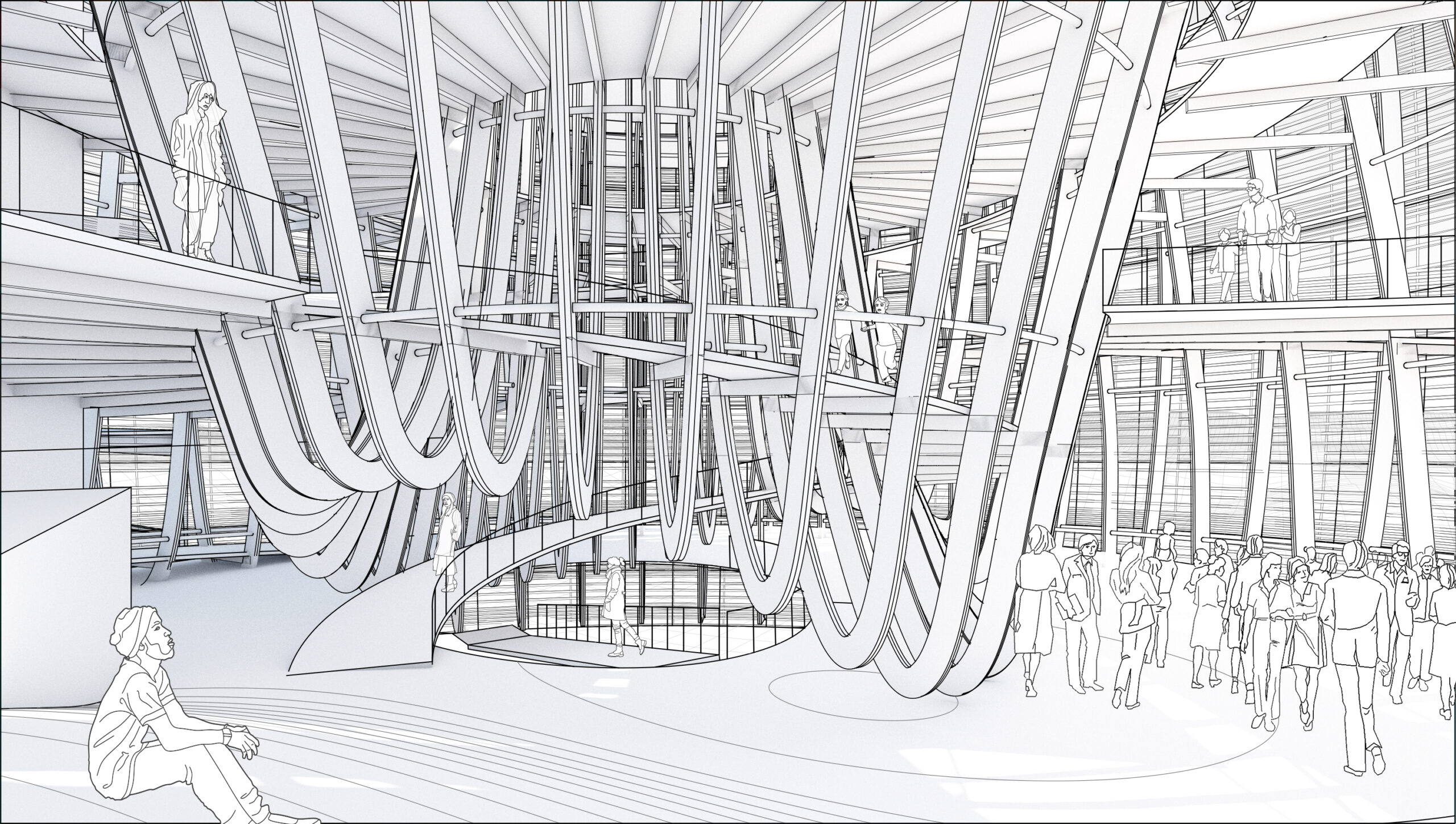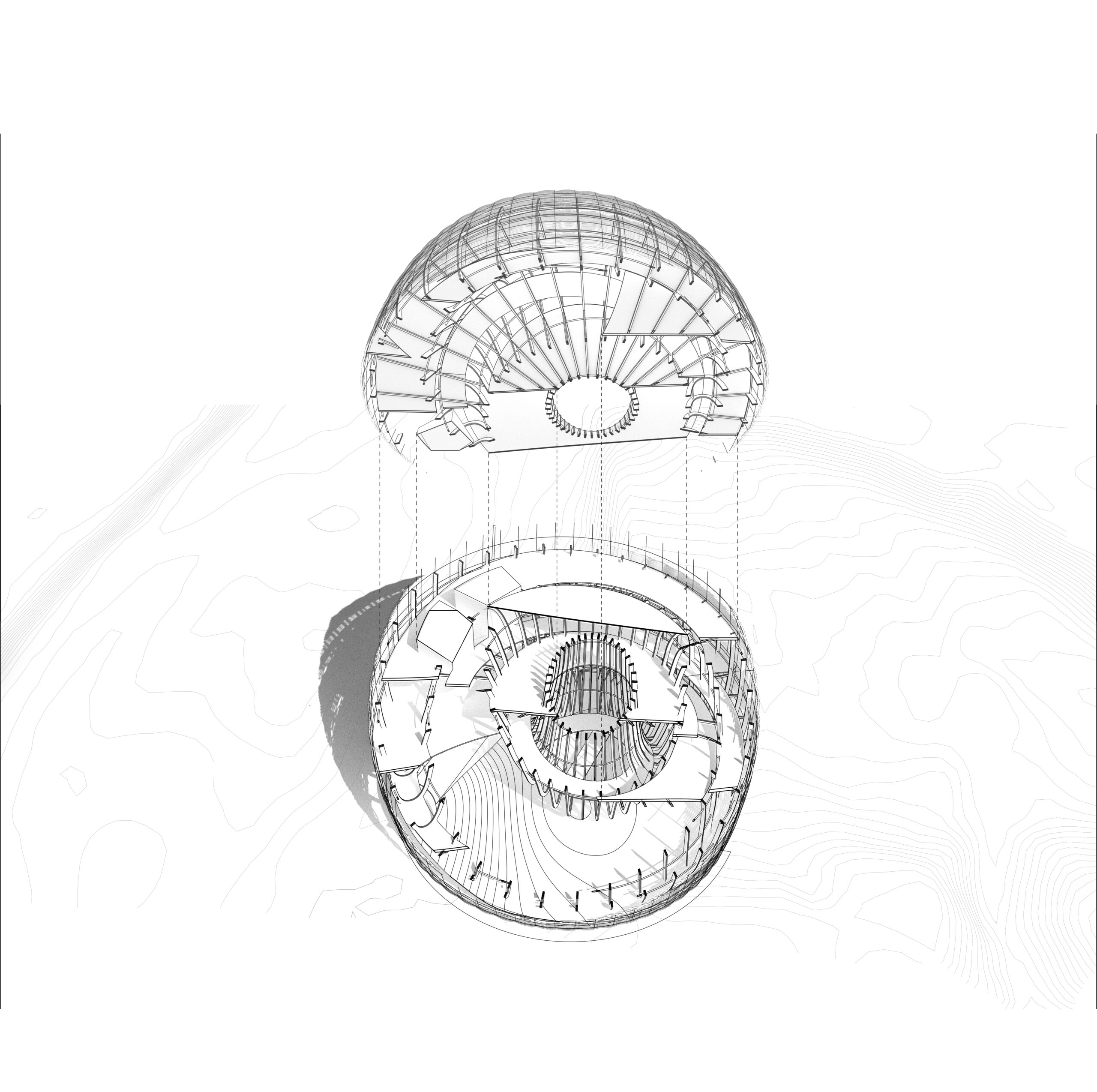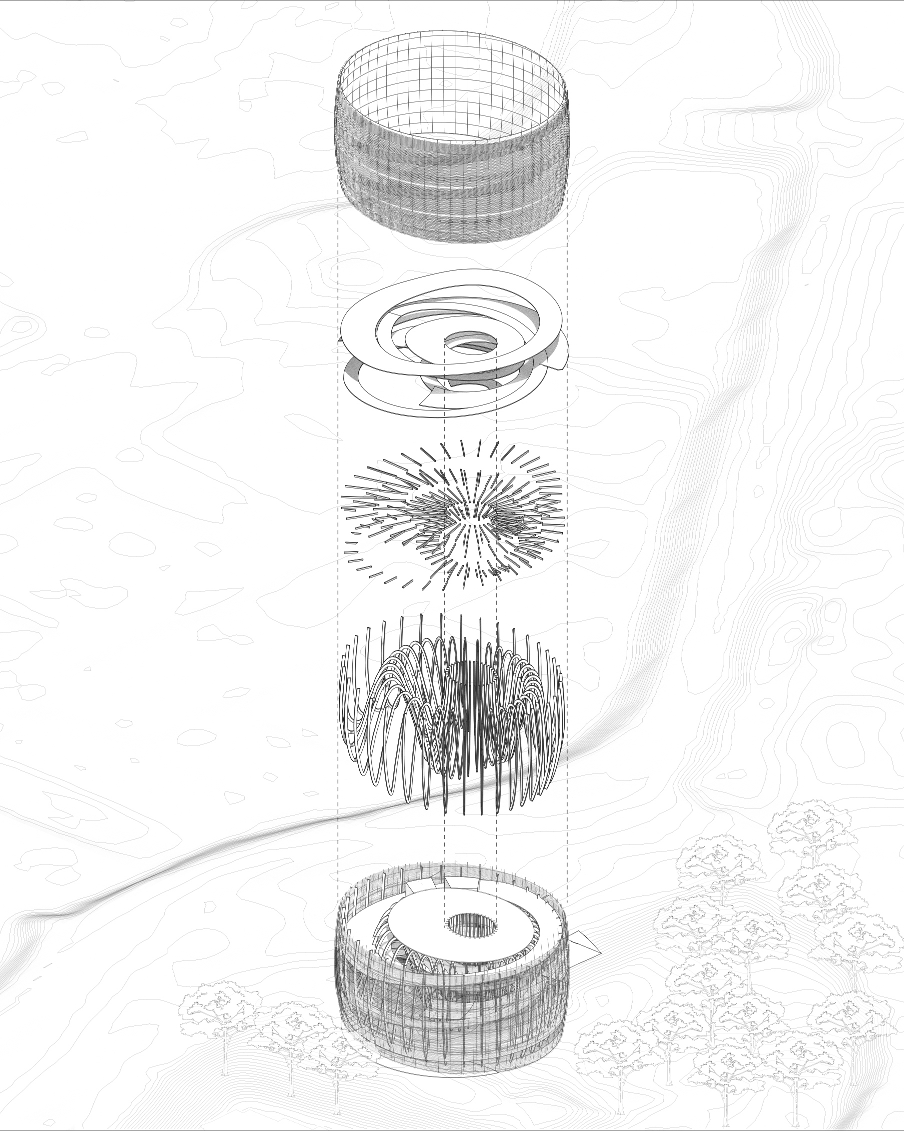 From the cone’s center, the architecture expands outward in layered weaves, unfolding as spaces for gathering, reflection, and exhibition. A spiraling circulation path recalls both the motion of woven fibers and the precedent of the Guggenheim Museum, offering visitors a continuous journey. Beginning at the ground plane, the spiral ascends through multiple platforms designed to accommodate exhibitions of varying scales. At the apex, a rooftop garden provides an immersive connection to the surrounding landscape, where visitors overlook the confluence of the Sacramento and American Rivers—waters that inspired the fish-trap concept. From there, the spiral continues downward, guiding the visitor along a descending loop that completes the narrative journey.