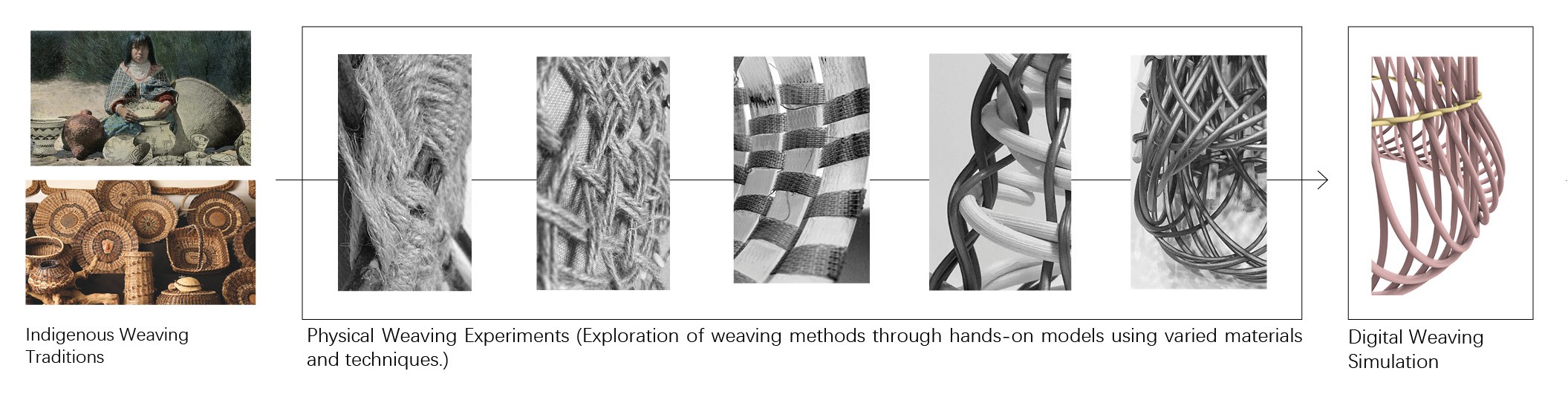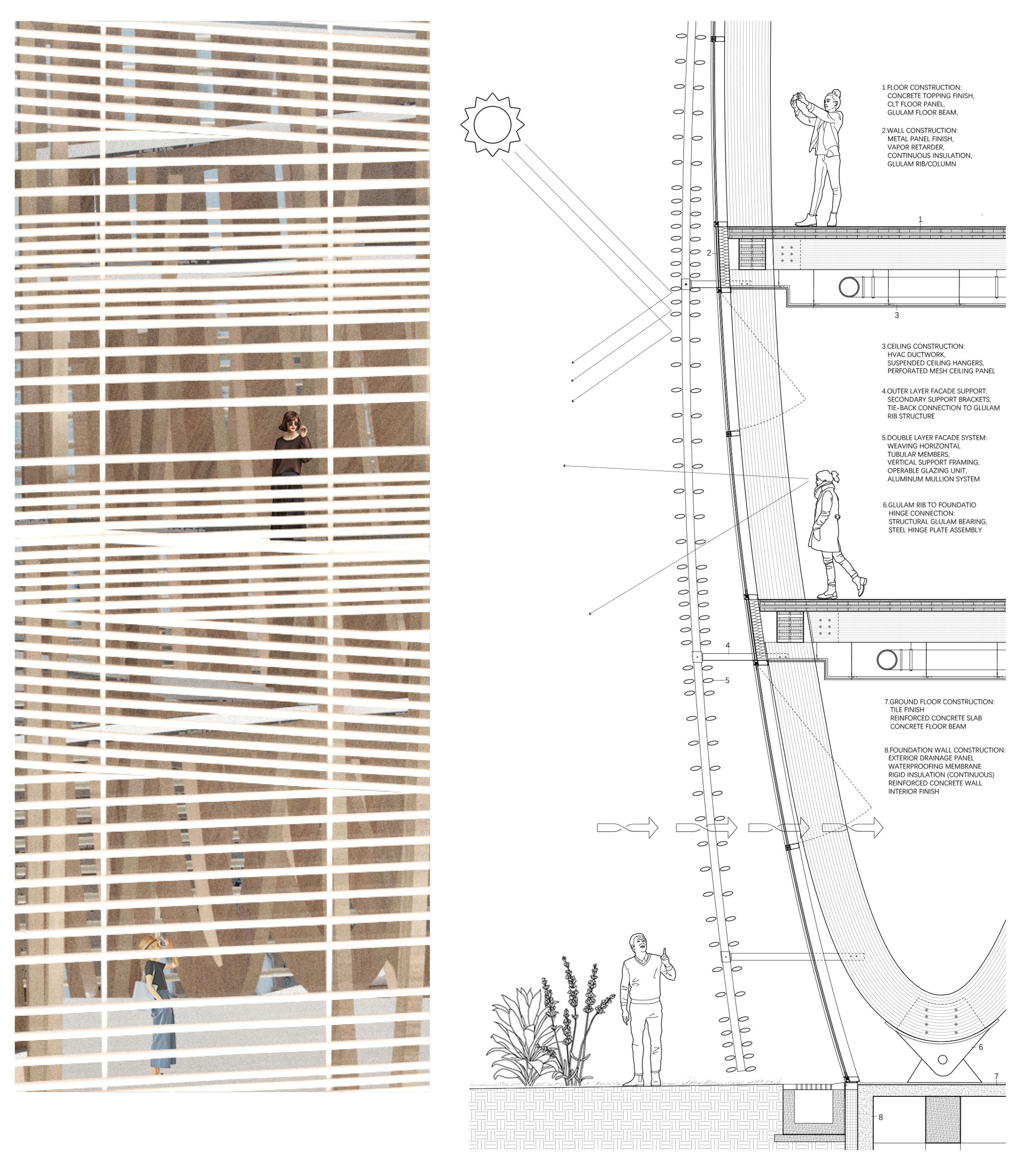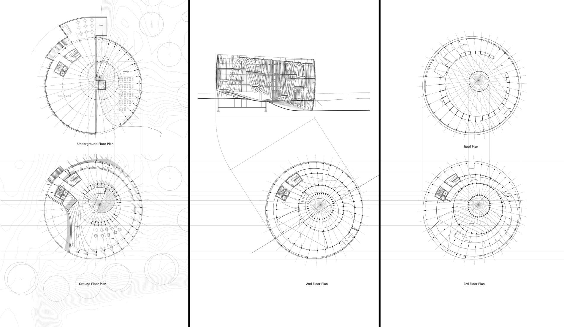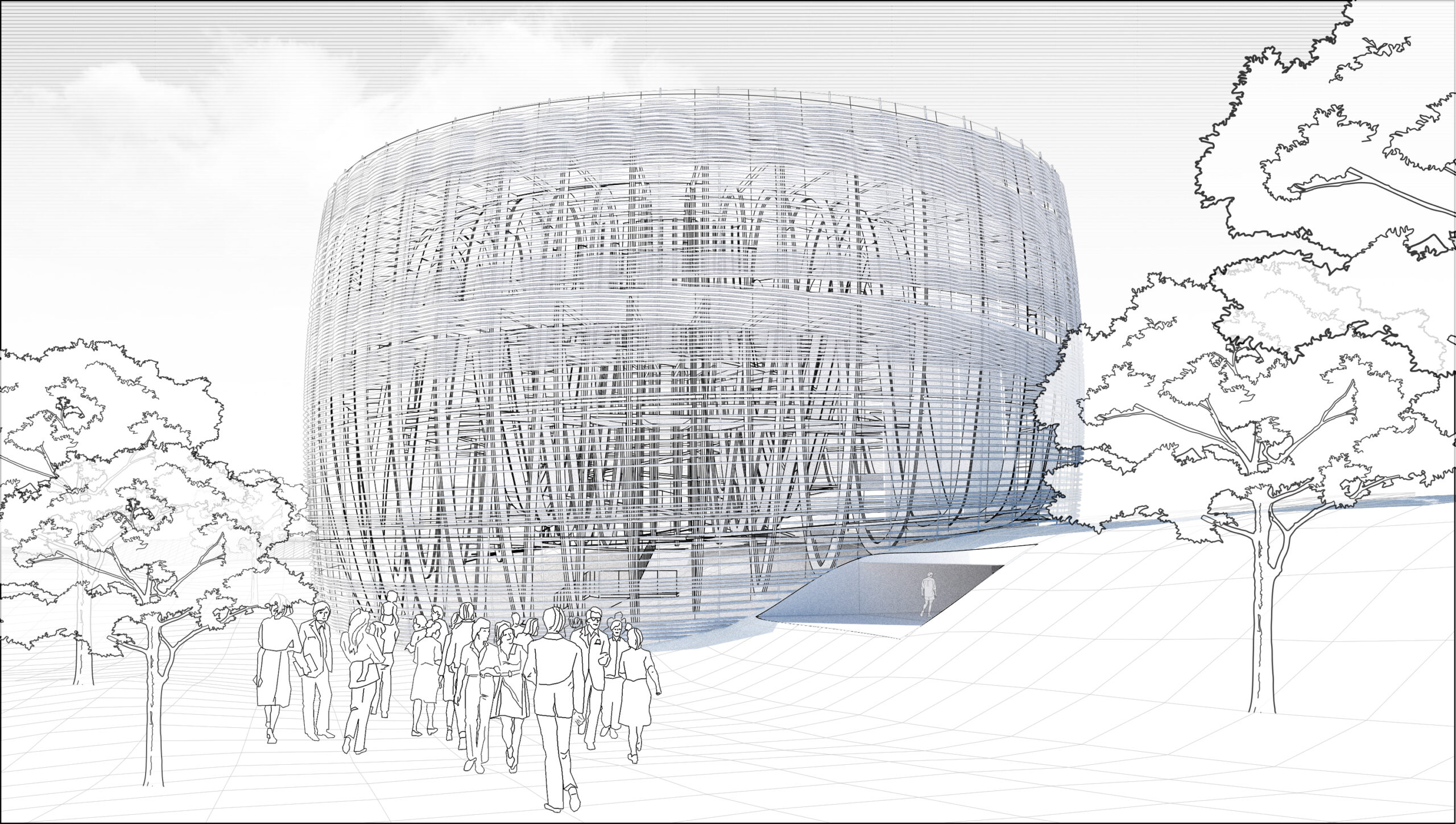 From the cone’s center, the architecture expands outward in layered weaves, unfolding as spaces for gathering, reflection, and exhibition. A spiraling circulation path recalls both the motion of woven fibers and the precedent of the Guggenheim Museum, offering visitors a continuous journey. Beginning at the ground plane, the spiral ascends through multiple platforms designed to accommodate exhibitions of varying scales. At the apex, a rooftop garden provides an immersive connection to the surrounding landscape, where visitors overlook the confluence of the Sacramento and American Rivers—waters that inspired the fish-trap concept. From there, the spiral continues downward, guiding the visitor along a descending loop that completes the narrative journey.