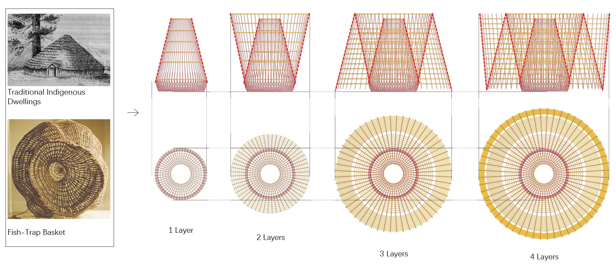 The design draws inspiration from indigenous basket-weaving traditions, specifically the fish trap basket. This artifact embodies both functional ingenuity and symbolic meaning: a cone nested inside a cylinder, porous enough to allow water to flow yet structured to hold life within. In architectural translation, the cone emerges at the core of the building, its narrow opening oriented skyward, echoing the form of traditional indigenous dwellings. Sunlight filters dramatically through this aperture, marking the interior with a spiritual and cyclical rhythm.