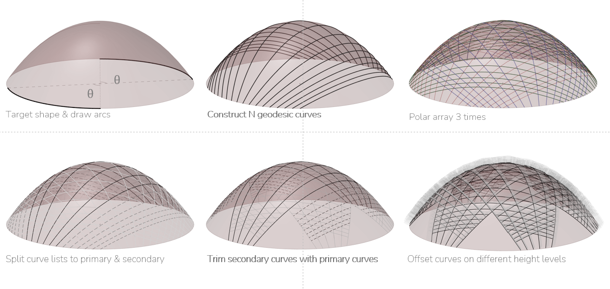 The CED Dome is a pavilion design that explores structural efficiency through geodesic geometry. The dome is formed by weaving geodesic curves that originate from three points on a half-circle, gradually interlacing to create a continuous, self-supporting shell. Geodesic geometry ensures that each wooden beam remains untwisted in three-dimensional space, allowing it to be fabricated from flat wood boards with minimal processing.