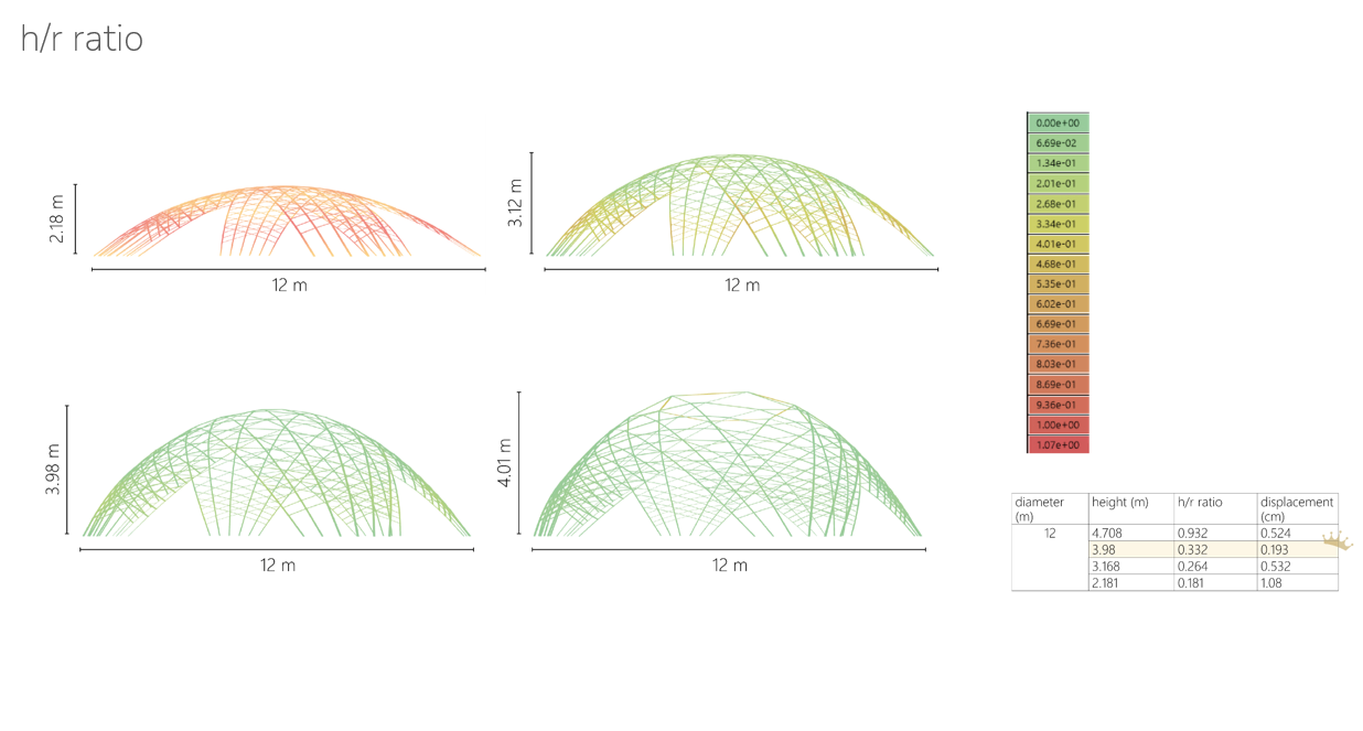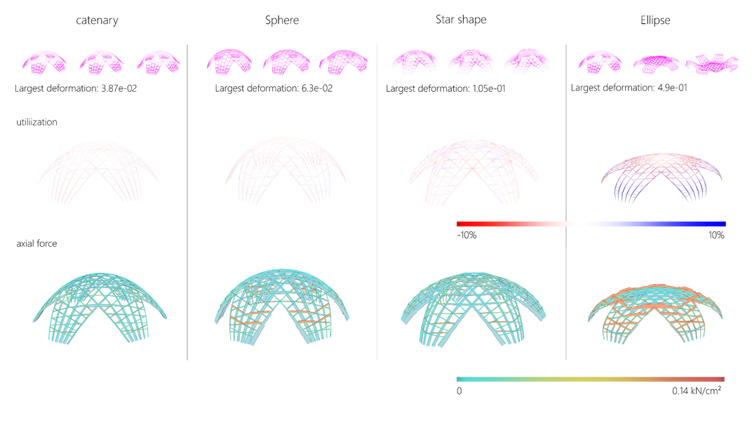 To refine the design, we employed Karamba structural analysis software to test variations in dome height and radius ratios, identifying the optimal configuration to resist vertical loads. Comparative studies of alternative geometries—including catenary, spherical, elliptical, and star-shaped domes—were conducted to evaluate performance and deformation under pressure.
