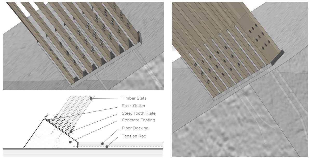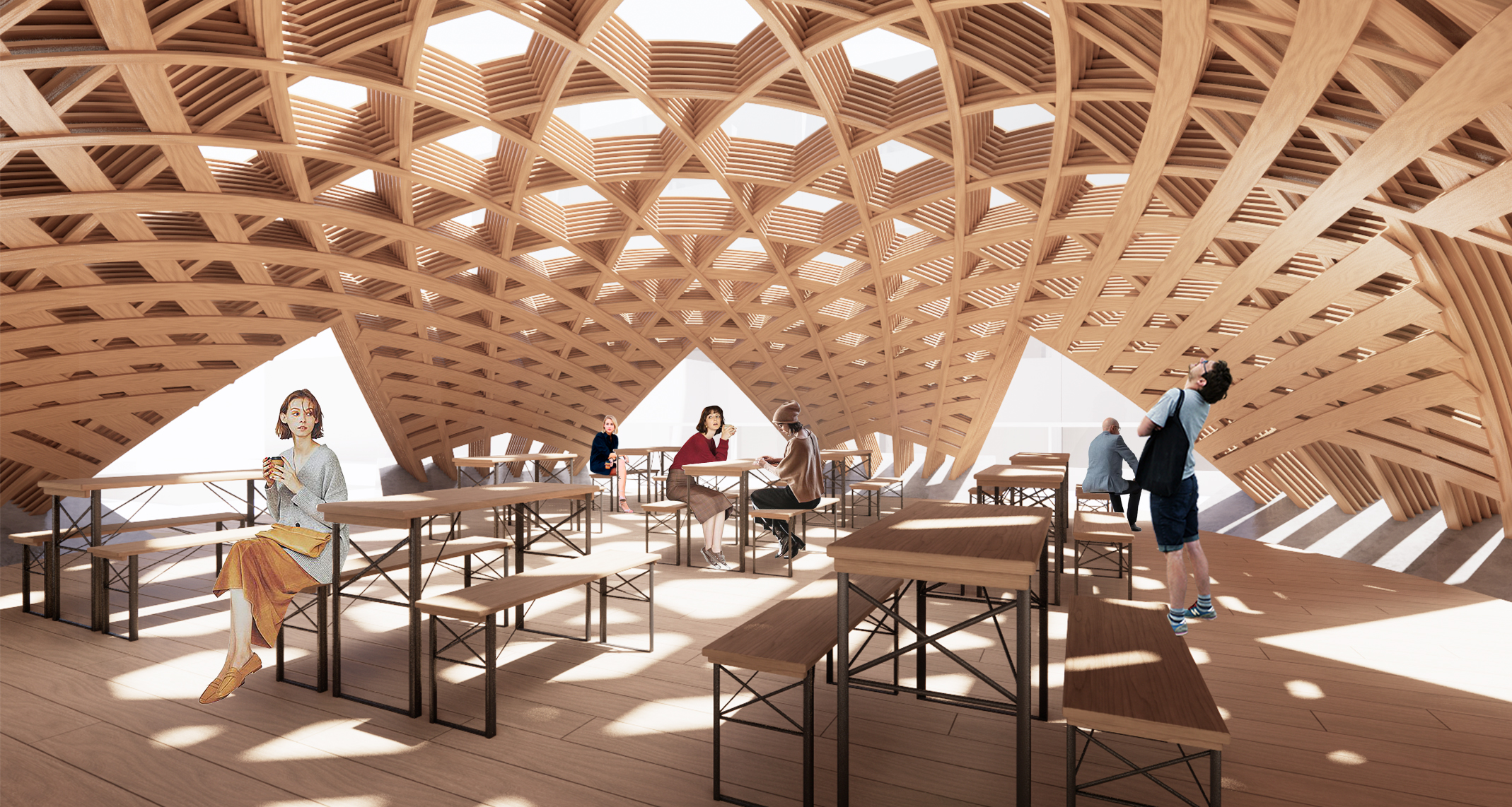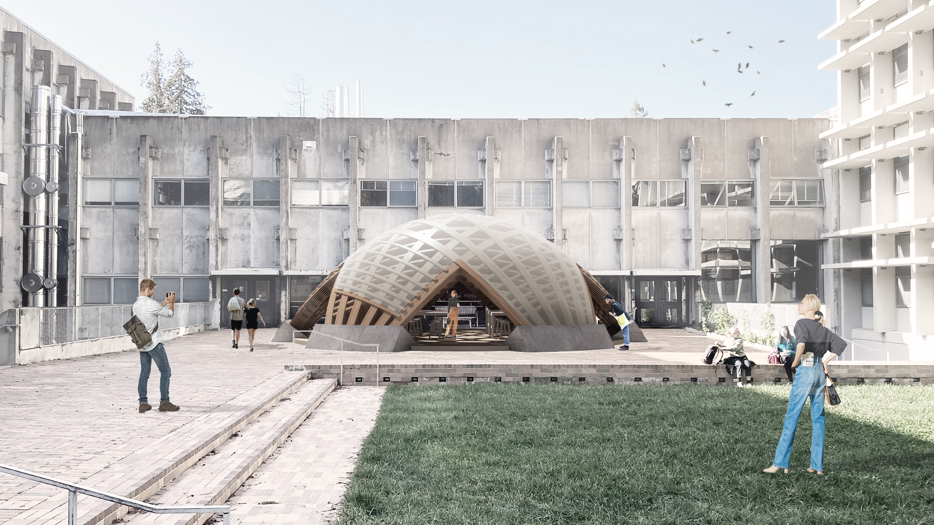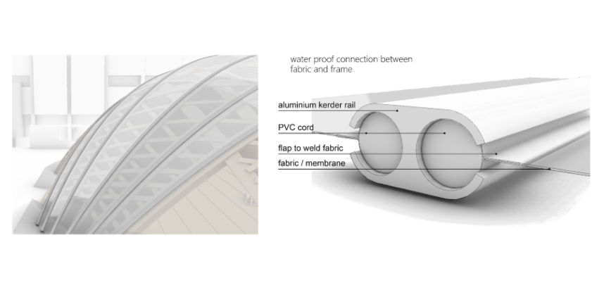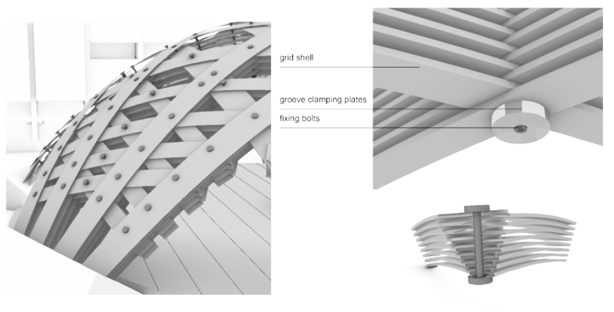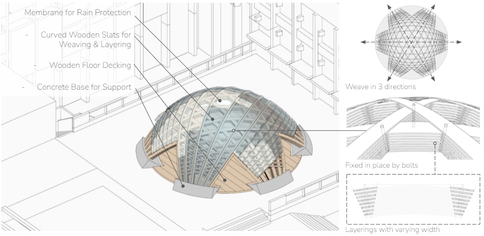 The dome’s structure is anchored by steel connectors embedded into concrete footers, protecting the beam ends from water exposure while ensuring long-term stability. Each structural element is composed of multiple layered beams, interwoven in alternating directions and fastened with bolts to enhance strength and resilience. A soft PVC membrane covers the dome, providing weather protection and shelter for users while maintaining transparency to natural light.