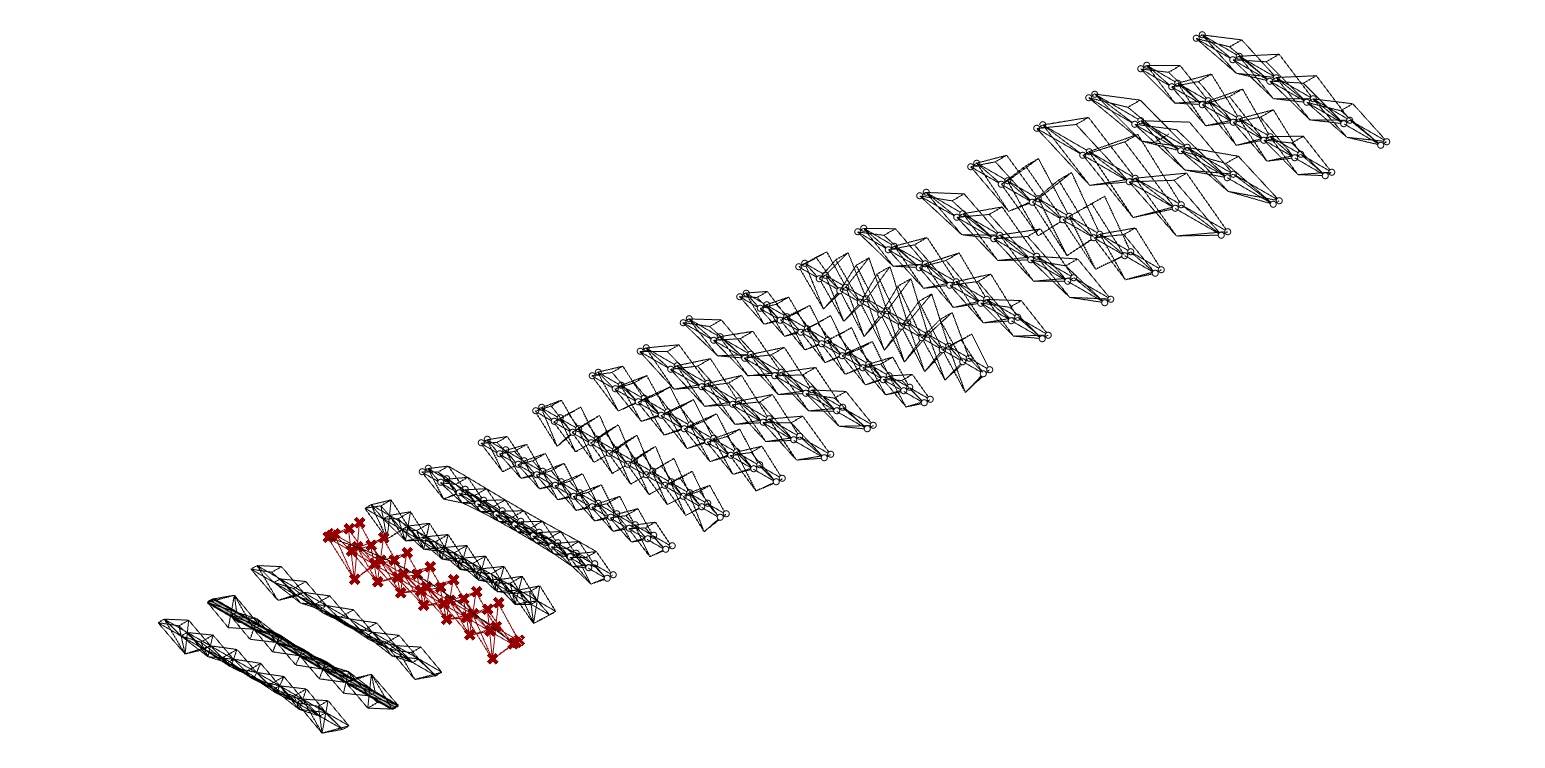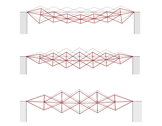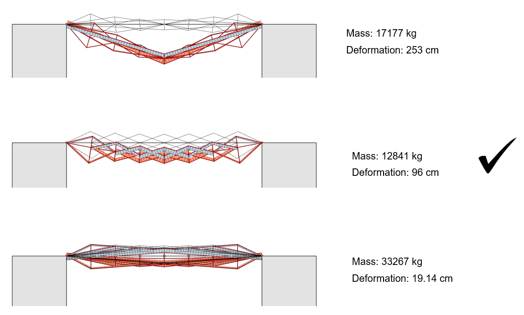 Through iterations in Karamba, we refined the form by testing variations in height and the number of bays. The final solution, a six-bay structure with increased vertical dimension, delivers both technical performance and a distinctive architectural presence. Its diamond-like geometry refracts across the void, echoing the crystalline clarity of engineered form, while maintaining a sense of lightness against the vast landscape.