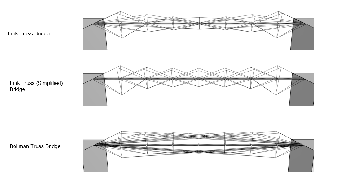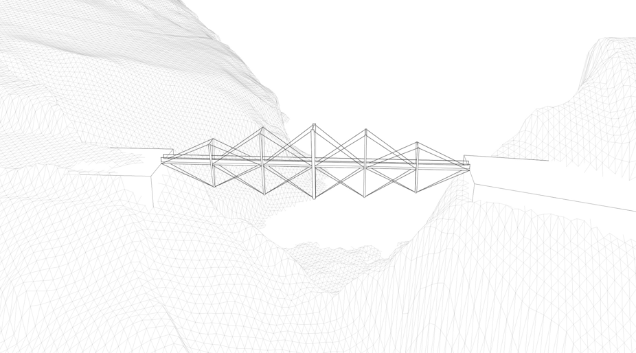 The Dimond Bridge emerges from the rugged cliffs as both a structural experiment and a sculptural gesture. Inspired by studies of classical truss systems, we explored prototypes of the Bollman Truss, the conventional Fink Truss, and a simplified Fink Truss through digital simulations. While the Bollman proved structurally superior, its heavy mass conflicted with our desire for lightness and elegance. The simplified Fink Truss revealed itself as a more balanced alternative—capable of achieving stability with less material, and therefore more aligned with our vision of a bridge that feels suspended rather than imposed.