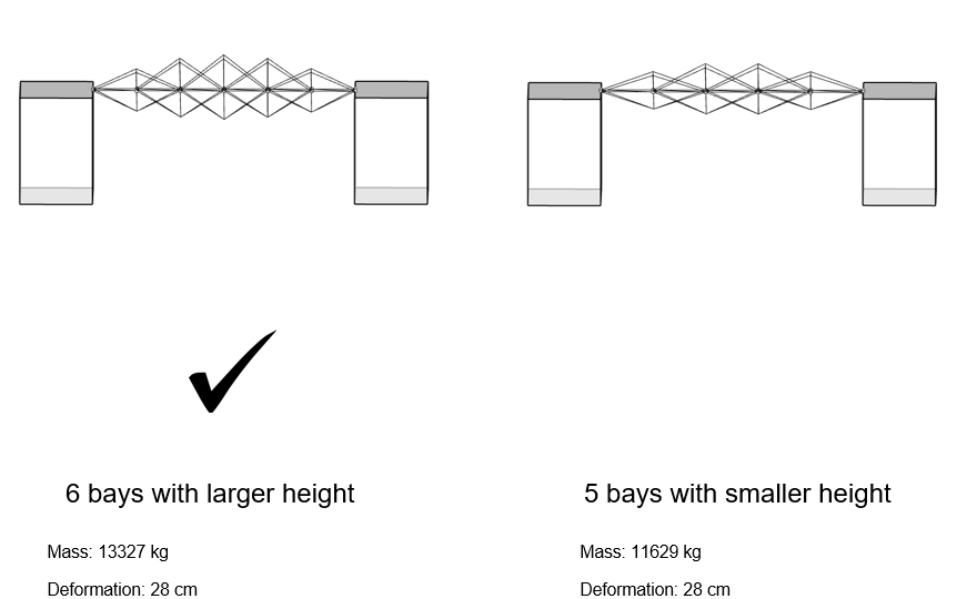 To reduce the deformation condition of the bridge: 1. Increase height, 2. Decrease the number of bays