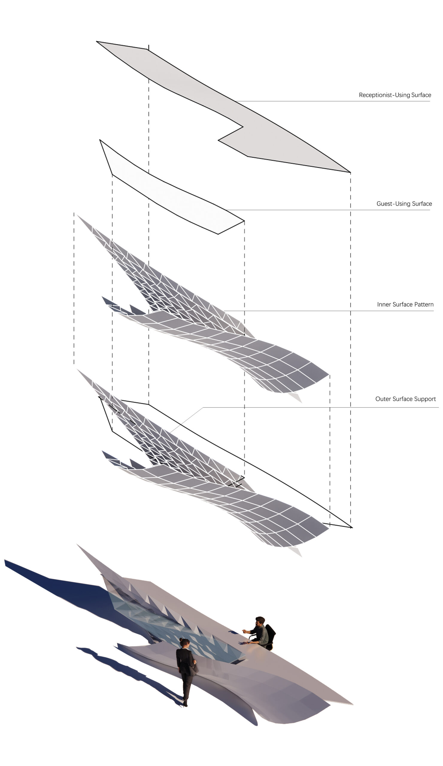 The Feather Reception Desk reimagines the traditional bulky reception counter by drawing inspiration from the fluidity and lightness of a feather. Instead of appearing heavy and monolithic, the design embodies movement, elegance, and delicacy, creating a welcoming centerpiece for visitors.