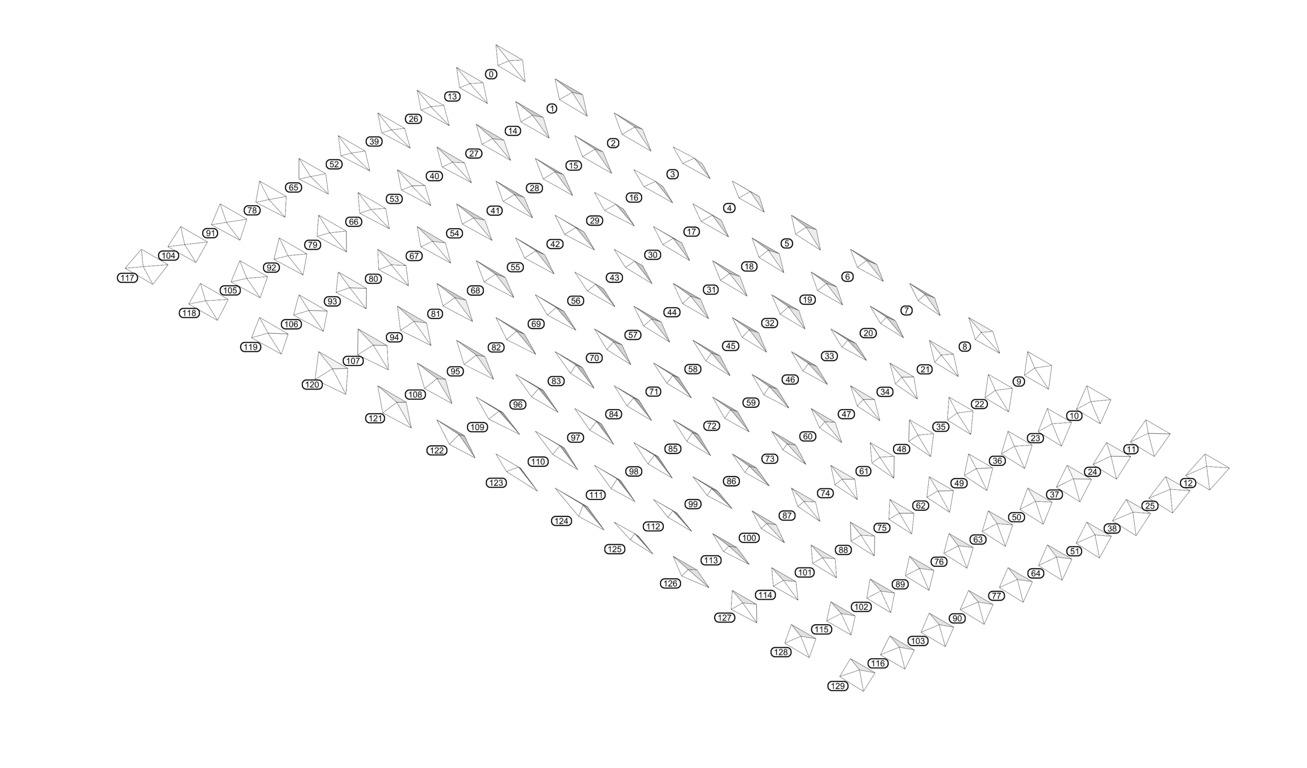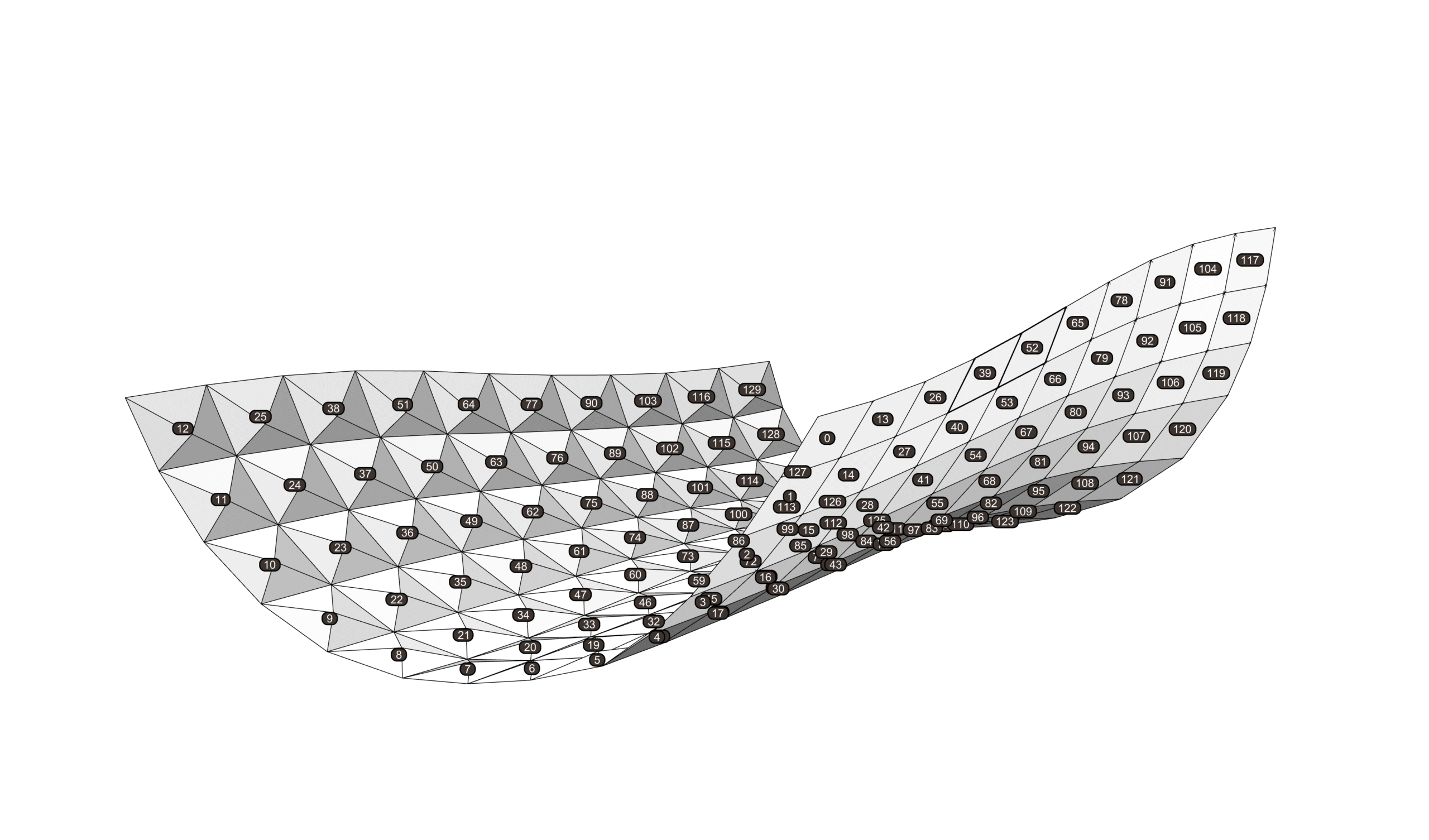 Each pyramid was assigned a unique identification number and then unrolled from the curved surface onto a flat plan. By numbering and laying out the components in this way, fabrication becomes straightforward: every pyramid can be manufactured individually and later matched precisely to its intended position on the surface. This system ensures both ease of production and accuracy during assembly.