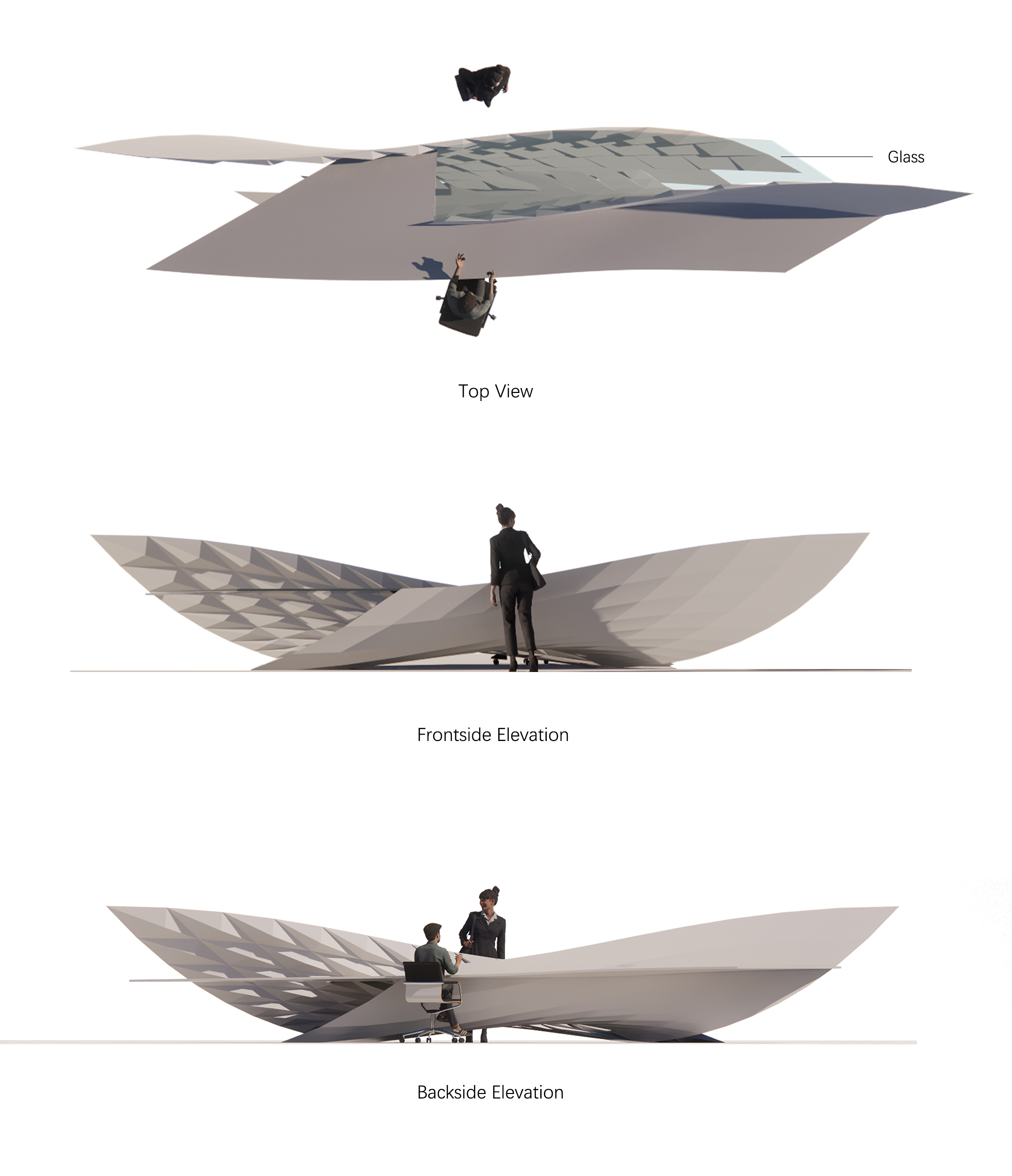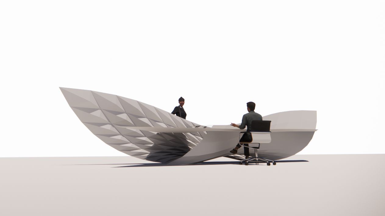 The desk’s outer surface flows in a continuous, sweeping curve, echoing the soft contour of a feather’s vane. In contrast, the inner surface is articulated with pyramidal modules,  producing a dynamic interplay of light and shadow.