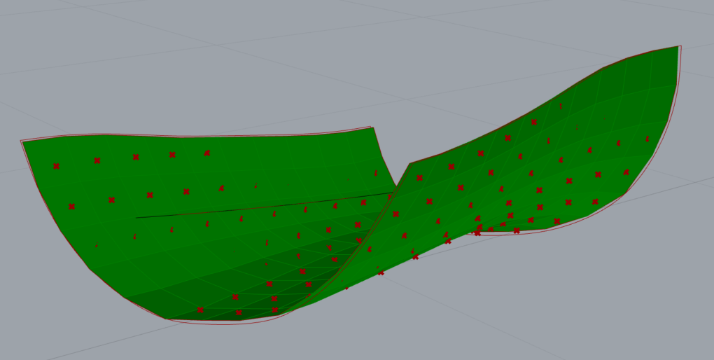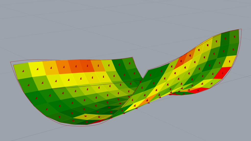 To ensure both constructability and precision, the form was optimized using Grasshopper. The surface was subdivided into a grid, and each panel was computationally adjusted to achieve planarity, providing a flat base for the pyramids to attach seamlessly. A color-coded analysis guided refinements, ensuring structural feasibility while preserving the fluid gesture of the form.