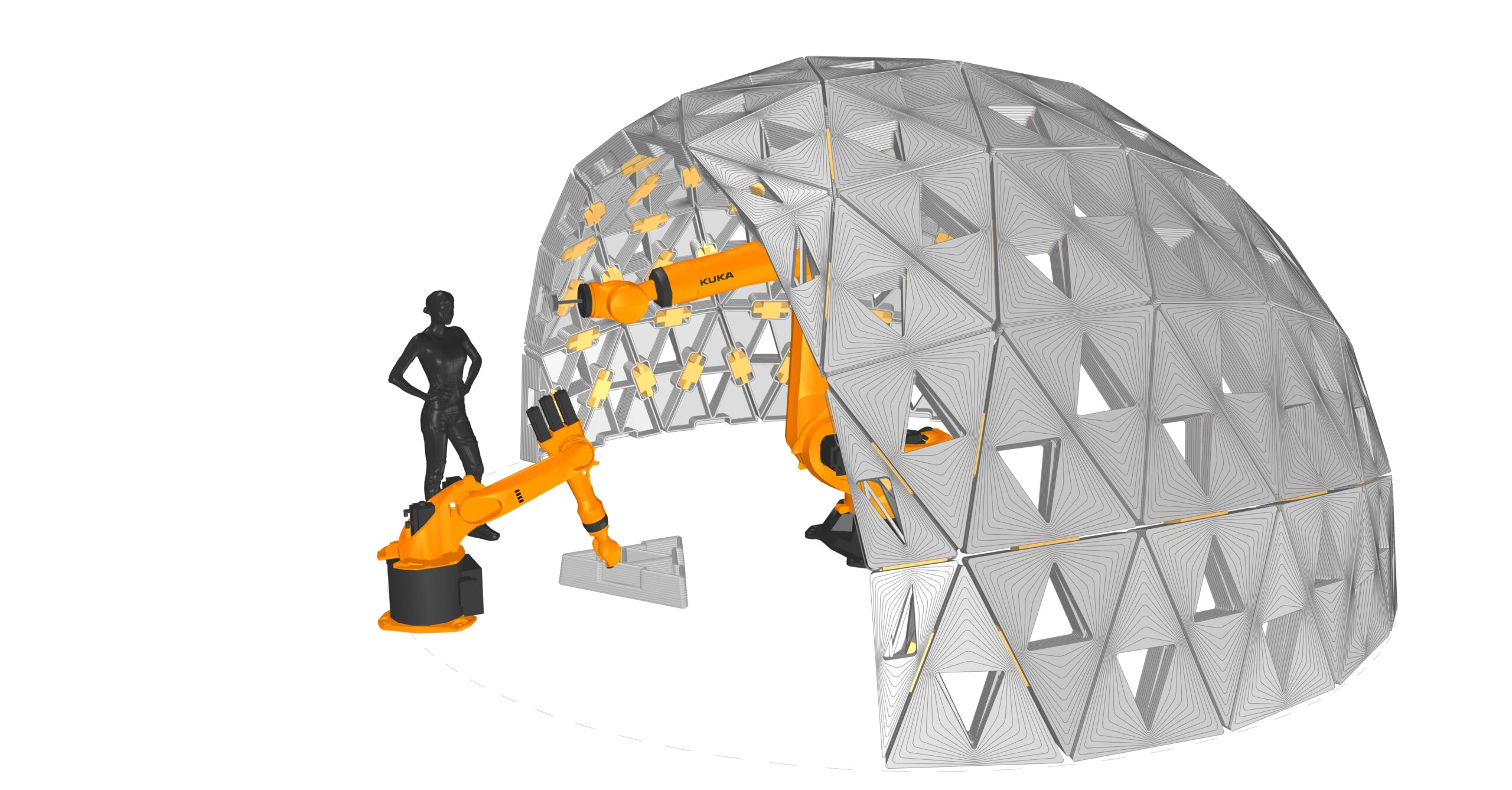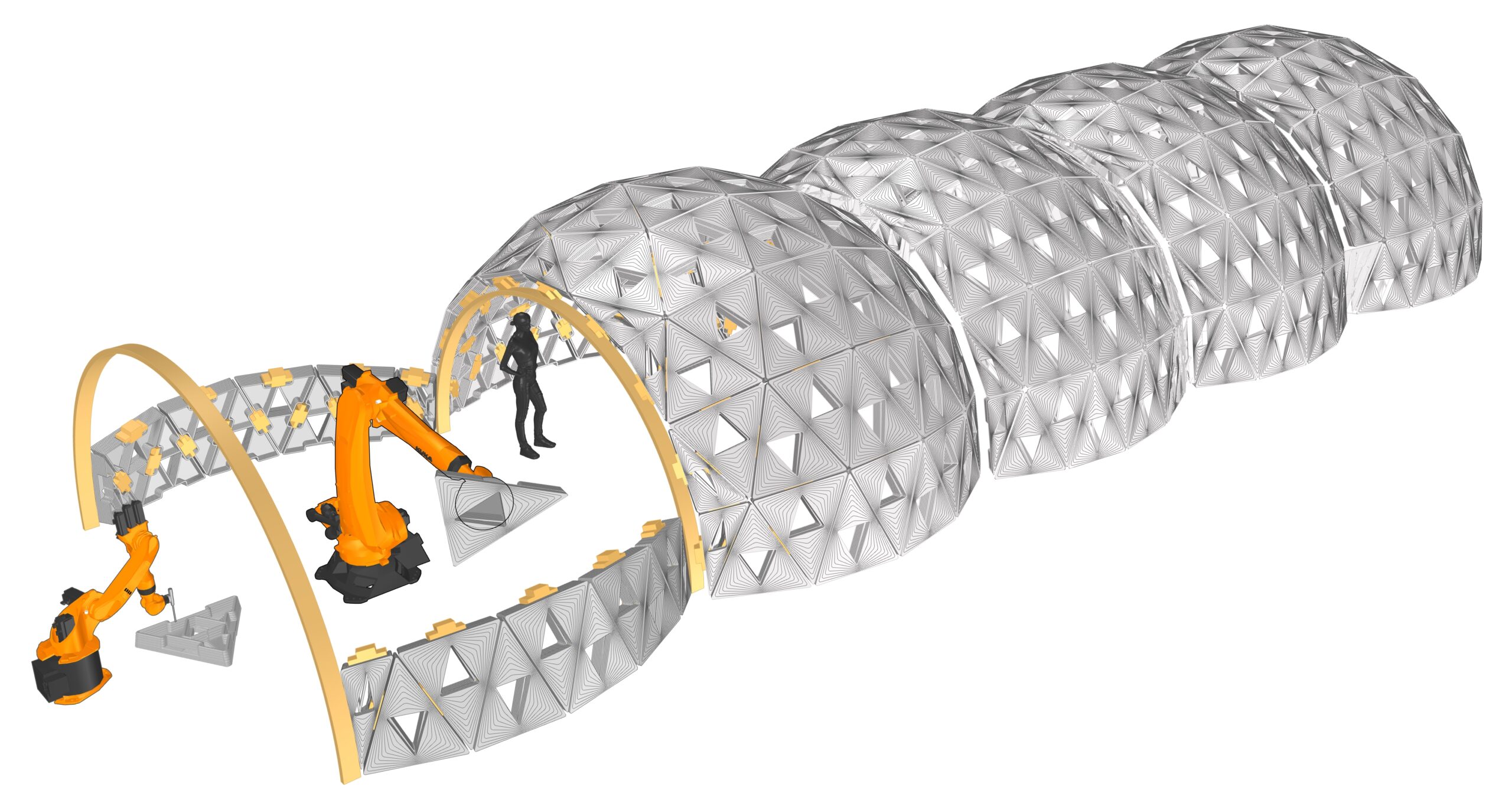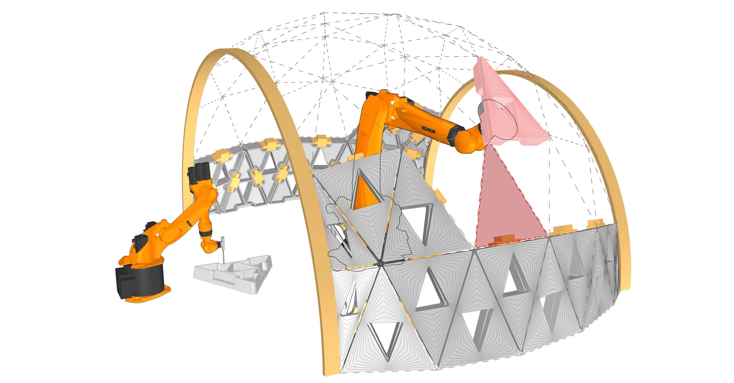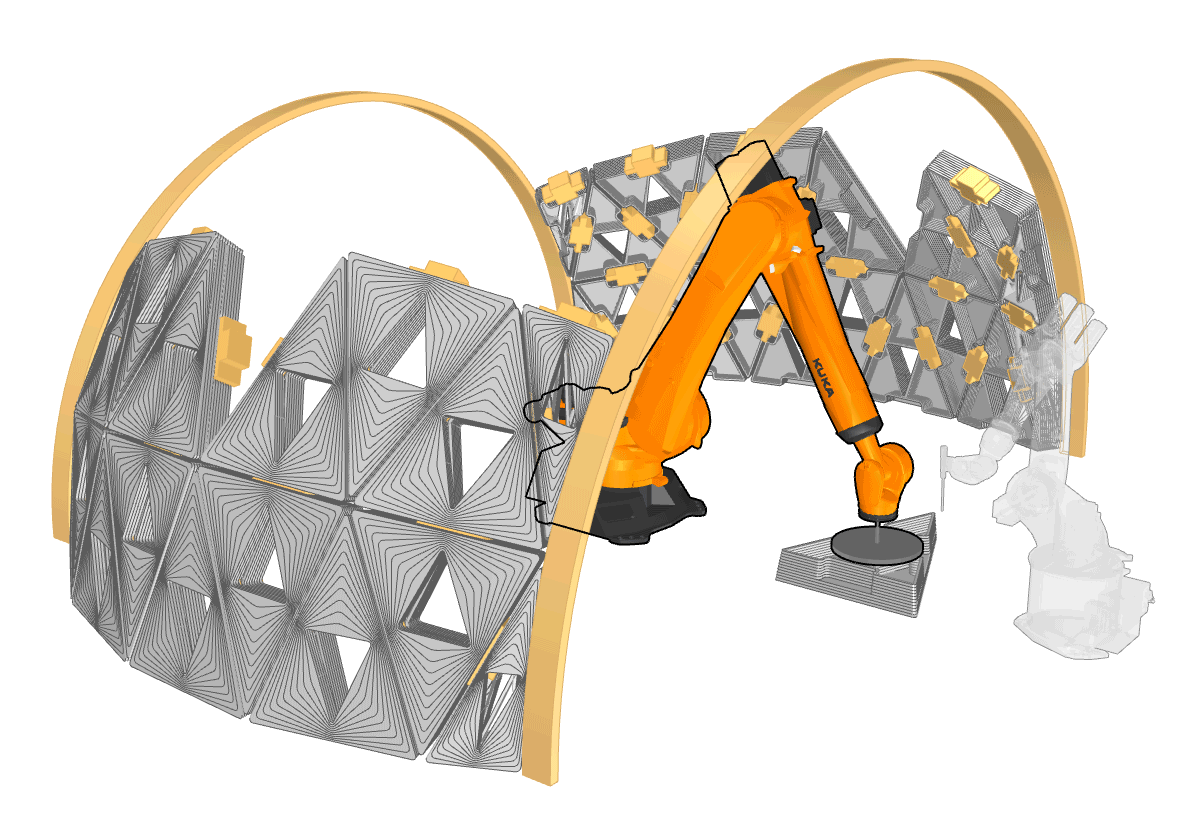 The pavilion serves as a testbed for studying robotic collaboration, modular precision, and adaptive assembly strategies. By decoupling the processes of printing and placement, the system demonstrates a method for parallelizing construction tasks, reducing inefficiencies, and allowing for greater flexibility in form generation. The study also examines how material behavior, unit geometry, and robotic path planning interact to influence structural stability and design outcomes.
